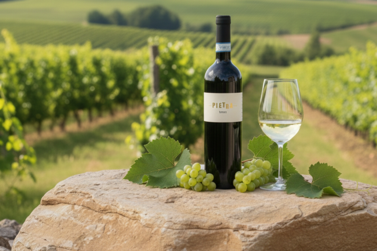 Il Pietra Teran 2021 è un rosso del Carso prodotto con la varietà Terrano, nota anche come "lupo solitario" per la sua difficoltà di coltivazione e spigolosità. Tuttavia, il lavoro meticoloso di Vina Pietra produce un vino intrigante: al naso si percepiscono aromi di ribes e ciliegia, accompagnati da note di tartufo nero.