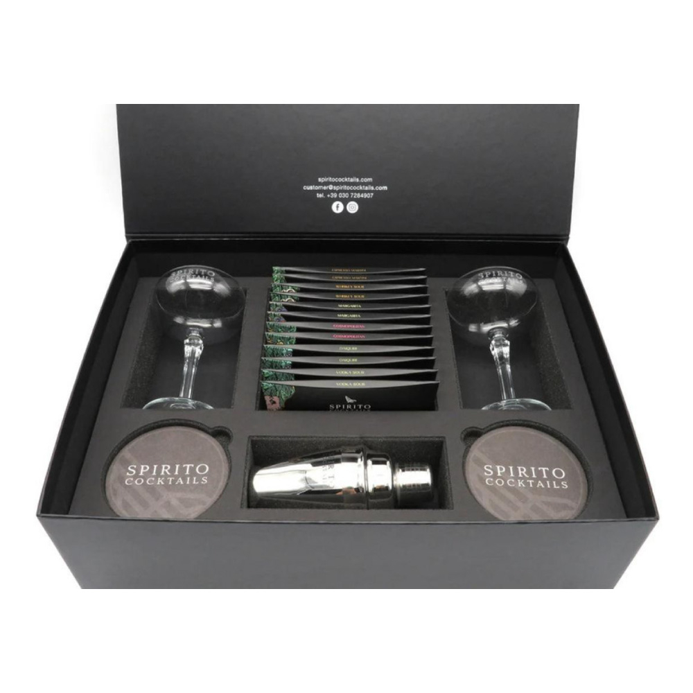 Potrai shakerarli alla perfezione ovunque vorrai! La box contiene: 2x Gin Sensation, 1x Negroni, 1x Passion Spritz, 1x Tommy’s Margarita, 1x Moscow mule, 1x Mojito, 1x Daiquiri, 1x Cosmo Thai, 1x Whiskey Sour, 1x Espresso Martini, 1x Margarita | Inoltre: 2x Coppe brandizzate in vetro, 2x sottobicchieri, 1x shaker in acciaio inossidabile